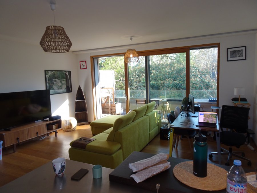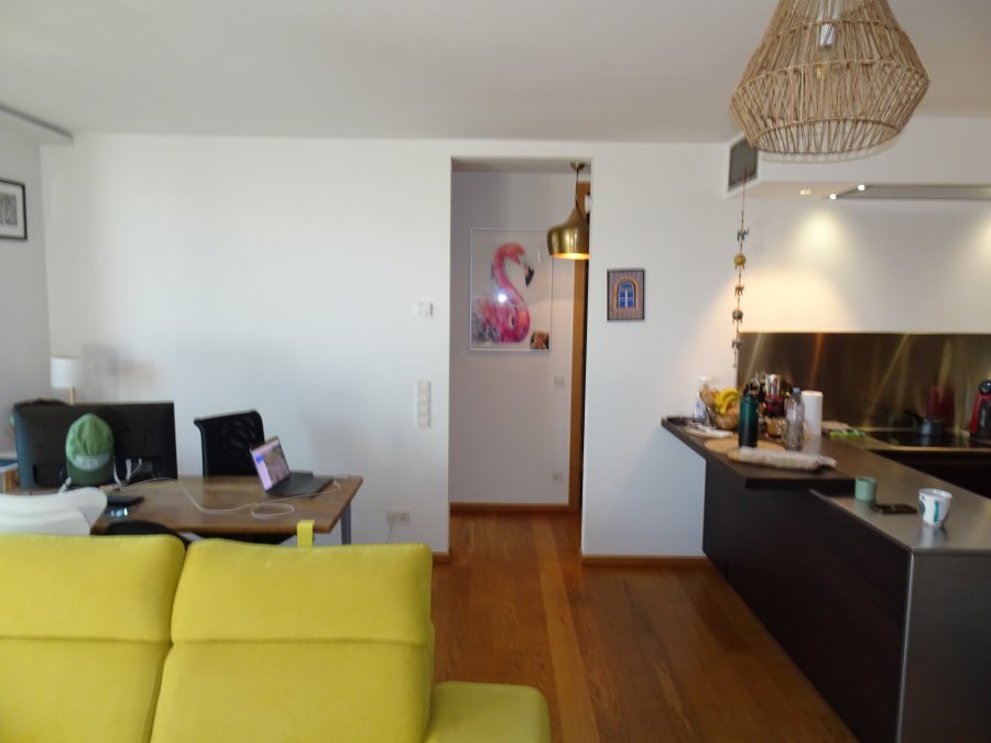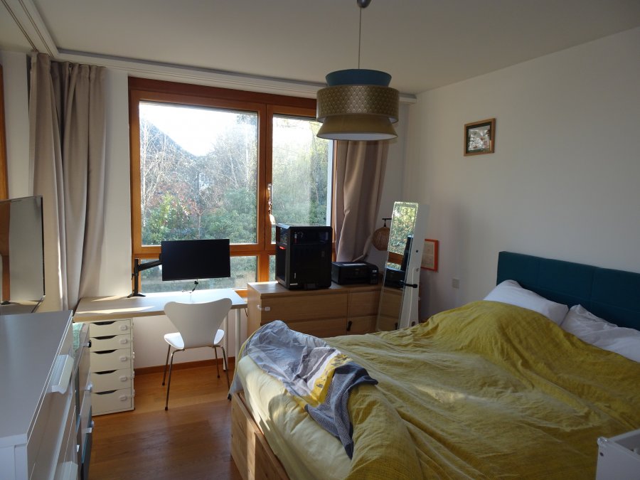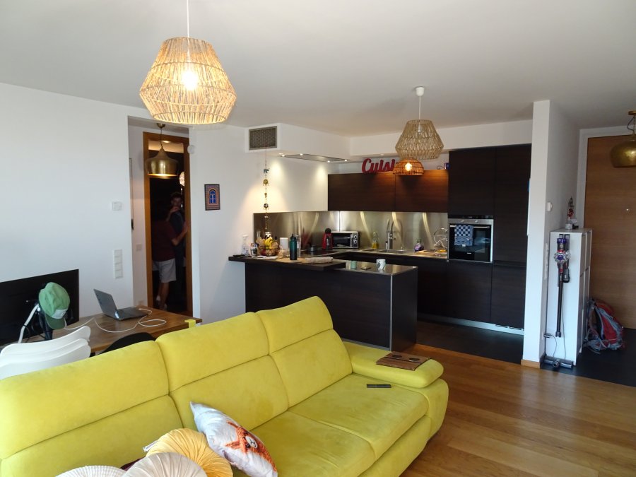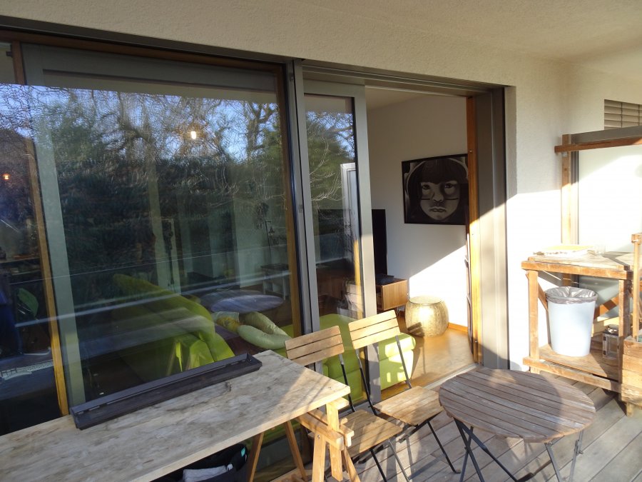L'appartement est situé au calme, au 3? étage d'une résidence moderne. Il dispose d'un spacieux séjour avec salle à manger et cuisine ouverte moderne, offrant un accès direct à un balcon ensoleillé (13 m²). Il comprend également une chambre à coucher avec accès au balcon, une salle de bains avec douche et baignoire ainsi qu'un WC séparé. Le balcon est orienté plein sud et entouré de nombreux arbres.